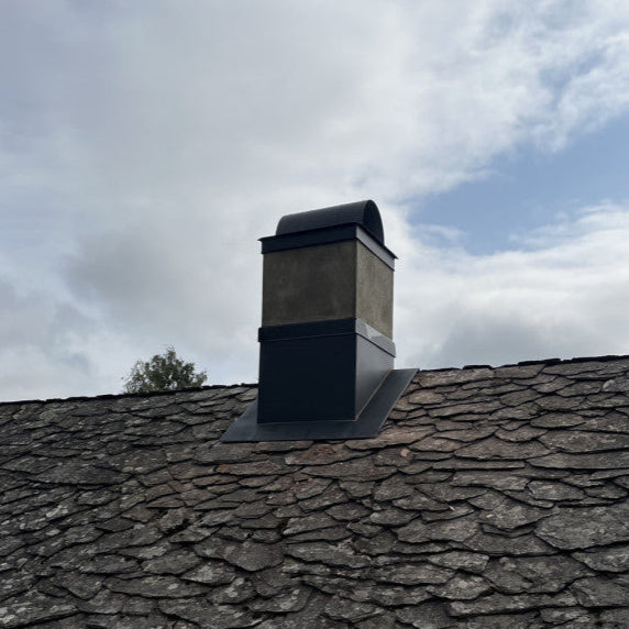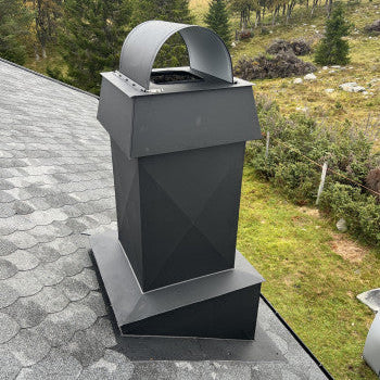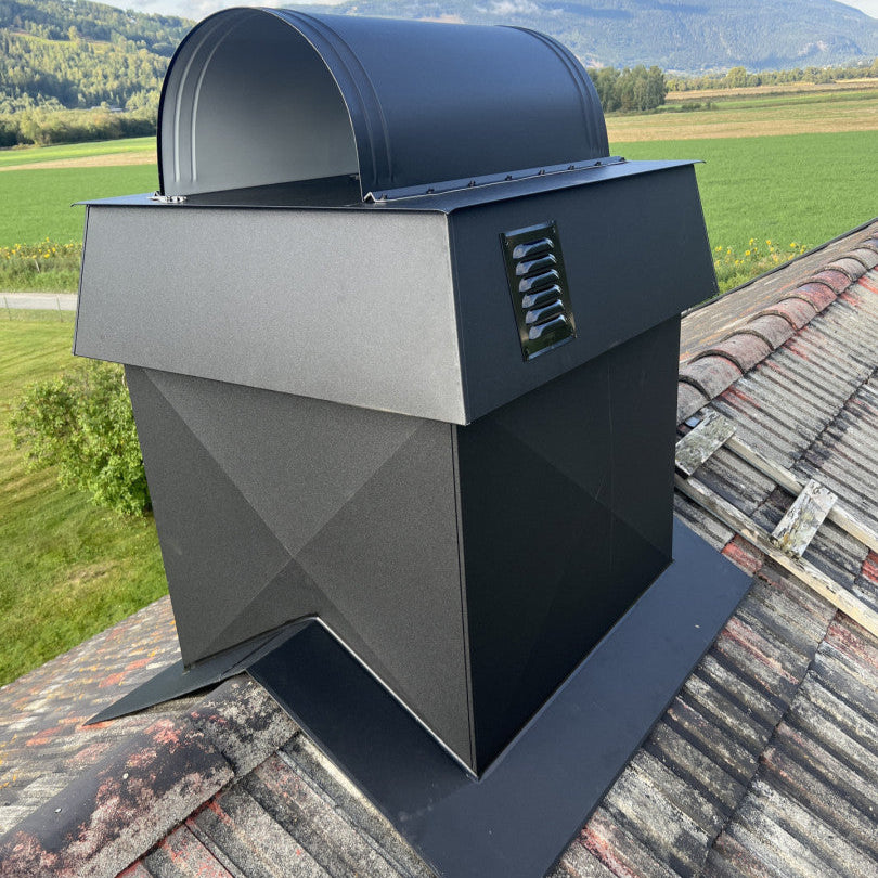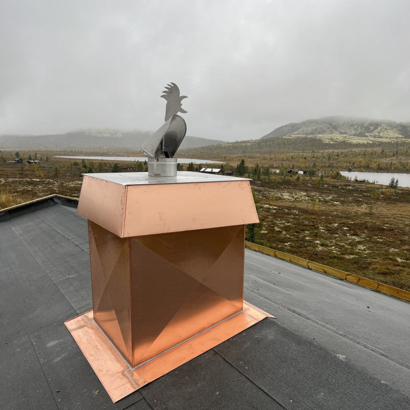 Vi har montert et stilfullt pipebeslag i kobber med en rustfri værhane på Venabygdsfjellet.